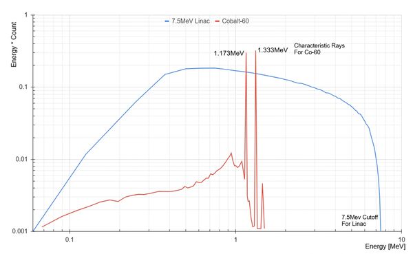 We have included the plots below to compare the energy spectrum of extragalactic gamma-ray background (EGB) radiation (Figure 1) to our own source and that of Cobalt-60 (Figure 2), the most commonly used radiation source for radiation hardness testing. While neither testing method completely covers the EGB spectrum, the linac covers a much larger range in a more even manor than Cobalt-60. Co60 delivers a good dose of 2 primary energy levels characterized by Beta decay; whereas our linac produces Bremsstrahlung radiation by bombarding a tungsten target with 7.5MeV electrons, resulting in a beam with a broadband continuous distribution of energy levels.
