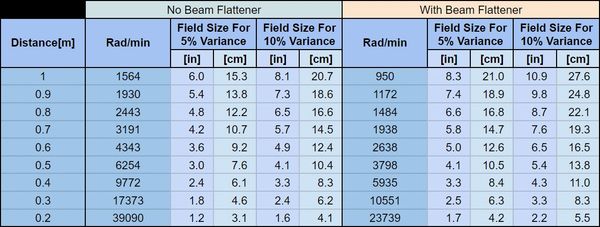 Using the last row as an example: A 2cm part can get a dose rate up to 39090 rad/min with negligible variations in beam distribution. The right thing to do for a 3cm part is to move it back 10cm, but you could also achieve that high dose of 39090 rad/min with up to 10% variation in beam distribution on the outer edges.