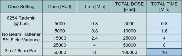 Shown above is an example testing program where the client may want to test the part for data intermittently before given the full radiation dose. Using both charts above, at full power, it is shown that a part smaller than 5cm in length can get a total dose of 100krads in a total "beam on" time of 16 minutes.